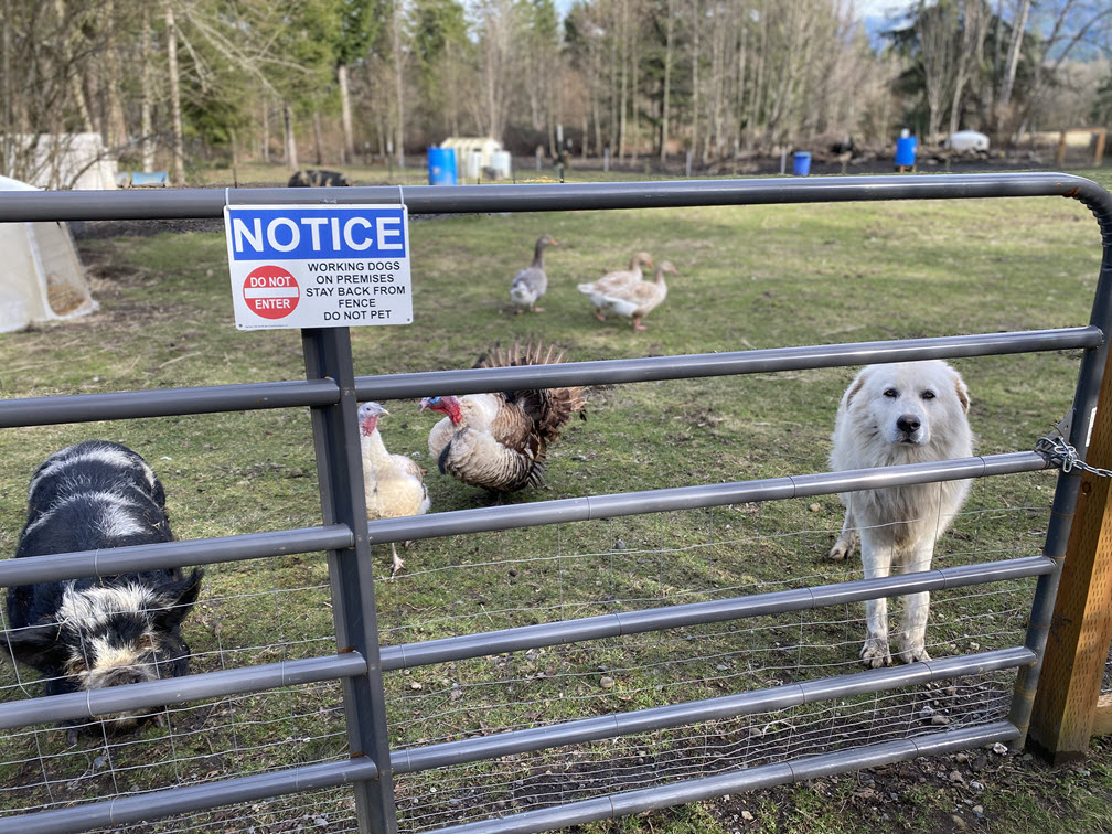 When we first started out, I wasn’t really sure what our predator load was. There were a lot of sleepless nights as I would listen to the coyotes mating calls coming from very nearby. I also learned our area has eagles and the occasional bear or cougar sighting, but I’ve never seen any of them here. We took a lot of precautions including installing outside lights, surrounding the perimeter of our property with electric netting, and keeping the animals fairly close to the main buildings. But ultimately, it was the fear of wild or stray dogs that finally convinced me to get an LGD.